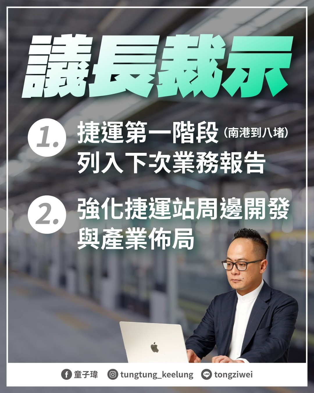 二、市府應強化捷運站周邊開發與產業佈局的連動規劃,整合都市計畫、產業招商與交通接駁等配套,讓捷運不只通車,更能創造工作機會、改善生活品質,真正提升市民福祉。